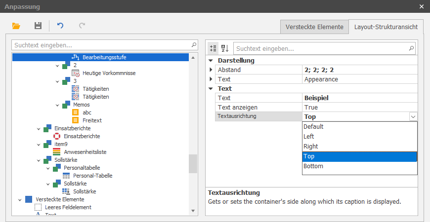 Text anzeigen: → True → Aktiviert die Beschriftung des Rahmens oder Containers. Ohne diesen Wert wüsste der Nutzer nicht, worauf sich der Status bezieht.Text: → Bearbeitungsstufe → Hier steht der sichtbare Titeltext wie „Bearbeitungsstufe“Textausrichtung: → Top (ausgewählt) → Platziert den Titel am oberen Rand des Objekts. Dies ist der Standard für Gruppenrahmen und sorgt für eine saubere Trennung der Formularabschnitte.Abstand: → 2; 2; 2; 2 → Definiert den Puffer zwischen dem Inhalt (z. B. dem Status-Feld) und dem Rand des Containers. Verhindert ein optisches „Quetschen“ der ElementeAppearance: Designvorlage → Hier werden übergreifende Stile wie Schriftgrößen oder Rahmenfarben zentral gesteuert, um ein einheitliches Design zu gewährleisten.
