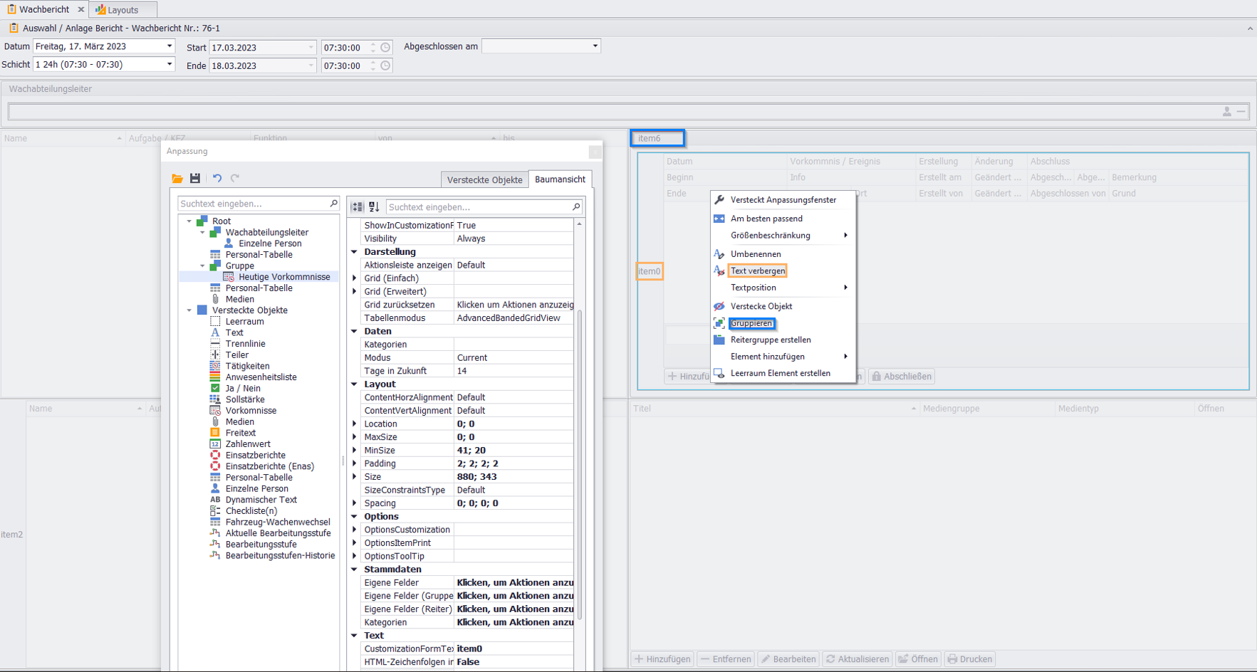 Dialog öffnen: Wählen SieLayout→Bearbeiten.BaumansiCht aufrufen: Im DialogAnpassungwählen Sie dieBaumansicht(linken Seite Dialogs) .Element selektieren: Selektieren Sie nacheinander eines der dargestelltenElemente(z. B. "Standardbesetzung", "Vorkommnisse").Berechtigungen wählen: Wählen Sie unterBerechtigungendie Rollen aus.