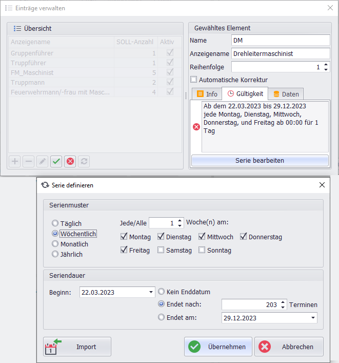Serie/Gültigkeitsdauerdefiniert werden (ab wann und wie lange die Auswertung der Soll-Stärke im Wachbericht Gültigkeit besitzt).Import Serie definieren: Die Eingabe einer kompatiblen Zeichenfolge neben dem Textfeld „