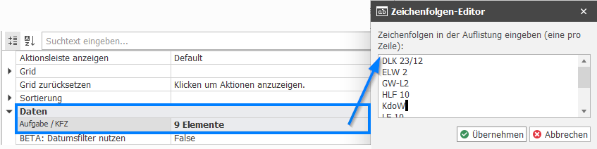 Fahrzeugreihenfolge festlegen („Zeichenfolgen-Editor“):