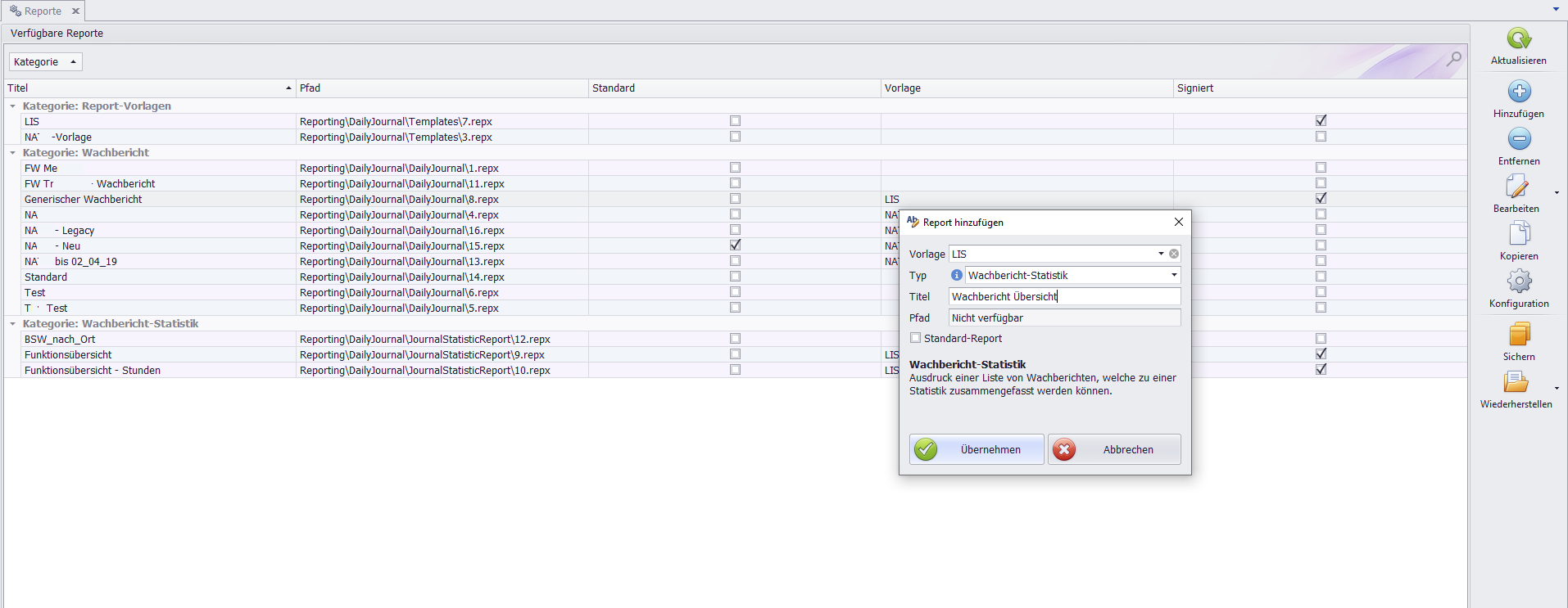 Vorlage: Wählen Sie mithilfe des Dropdown-Menüsymbols (▼) IhreVorlage(Listen-Header) aus.Report-TYP: Wählen Sie den gewünschtenReport-Typenaus der vorsortierten Liste (zum Beispiel der TypWachbericht Führerscheine).Titel: Geben Sie Ihren Titel nach Ermessen ein (zum BeispielWachbericht Übersicht).Pfad: Das Textfeld für den Pfad zeigtNicht verfügbaran. Der Pfad wird automatisch zugewiesen wird und keine manuelle Auswahl ist möglich.Checkbox: Sie können über die Checkbox festlegen, ob dieser Report alsStandard-Reporthinterlegt werden soll.