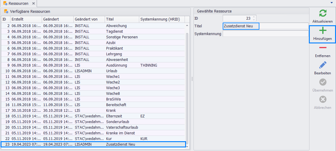 Schritt 2. Hinzufügen: Das Hinzufügen einer neuen Ressource erfolgt in der rechten Formularhälfte unter Gewählte Ressource.