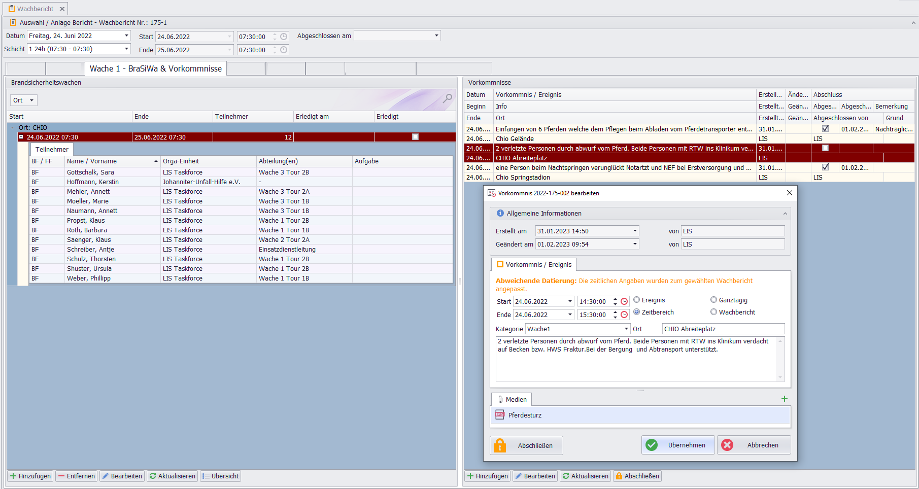 Die Brandsicherheitswache ermöglicht das Hinzufügen von Vorkommnissen und Ereignissen sowie Medien, um diese später nachträglich zu bearbeiten.
