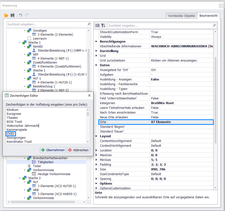 Layout-Anpassung öffnen: Wenn Sie die Option auswählen, öffnet sich der DialogAnpassungsowie ein Dialog mit wichtigen Hinweisen zurWachbuch-Layout-Sicherheit.BraSiWa-Element wählen: Wählen Sie, wie im Beispiel gezeigt, links in der Baumstruktur dieBraSiWaderWache 1aus.Layout-Details: Die Layout-Anpassungen, wie z. B. Darstellung, Daten, Grid, Options etc. für die BraSiWa werden nun in der Baumstruktur angezeigt.