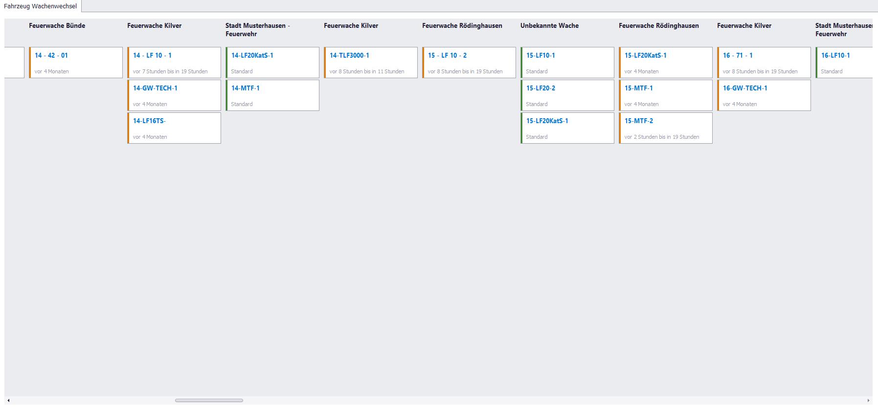 Orange gekennzeichnet: Fahrzeuge an anderen Standorten – aktuell nicht verfügbar für die heimische Wache.