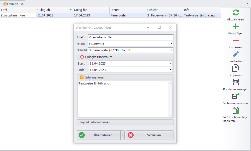 Titel, denDienst(z. B. Feuerwehr), dieSchicht(z. B. 24h) und den Gültigkeitszeitraum nach Bedarf.AKTUALISIEREN: Bestätigen Sie die Änderungen, um das Layout zu aktualisieren.