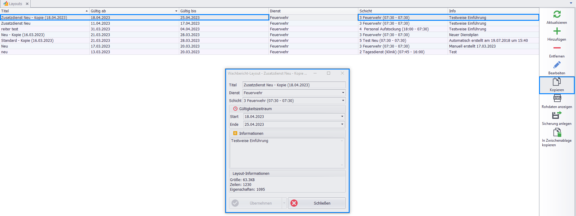 Hinzufügen,Bearbeiten,Kopierenund Layout-Sicherung ist vorhanden.Namenskonzept: Titel, Dienst, Schicht und Gültigkeitszeitraum sind eindeutig festgelegt.