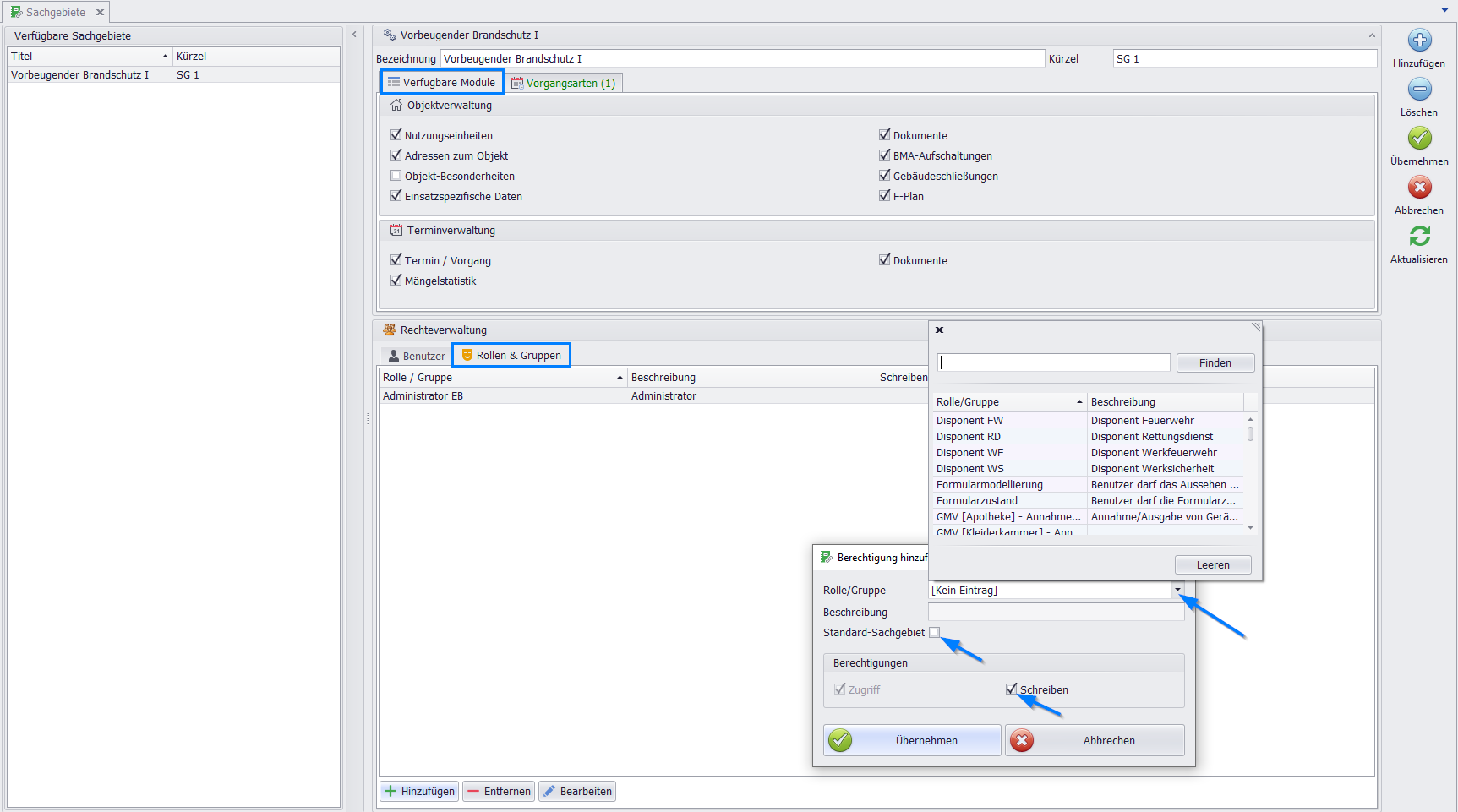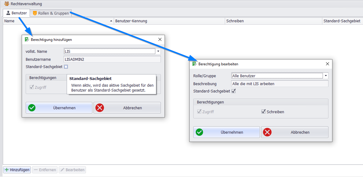 Bei der Rechteverwaltung können bestimmten Benutzern oder Rollen/Gruppen schreibende Berechtigungen für ein bestimmtes Sachgebiet erteilt werden.