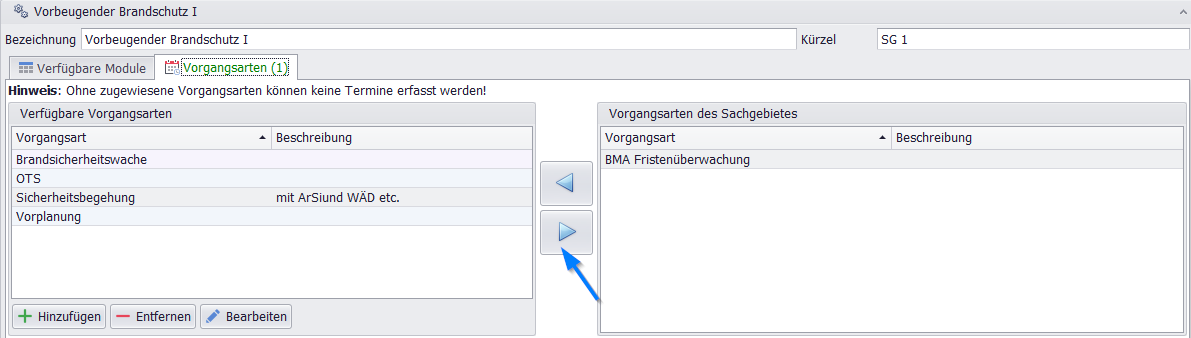 Vorgangsarten definieren, welche Art von Terminen innerhalb eines Sachgebiets erfasst werden können (z. B. Brandschutzprüfungen oder Gefahrenanalysen). Die Zuordnung von Vorgangsarten zu Sachgebieten stellt sicher, dass Bearbeiter/Nutzer nur Termine auswählen können, die für ihre Zuständigkeit relevant sind.