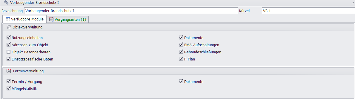 Zugriffsregelung: Sachgebiete steuern den Zugriff auf bestimmte TAB-Seiten (Registerkarten).Voraussetzung für die Bearbeitung: Die Definition der erforderlichen Sachgebiete ist die Voraussetzung dafür, dass ein Benutzer ein Formular vollständig bearbeiten kann.Freischaltung von Modulen: Nach der Definition der Sachgebiete werden die Checkboxen unter "Verfügbare Module" (z. B. "Objektverwaltung" und "Terminverwaltung") zur Auswahl freigeschaltet.Zugriff auf Inhalte: Mit der Auswahl dieser Module erhalten Benutzer Zugriff auf die dazugehörigen Inhalte.
