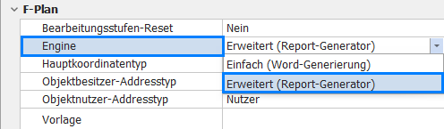 Konfiguration F-Plan Einfach (Word-Generierung)/Erweitert (Report-Generator)
