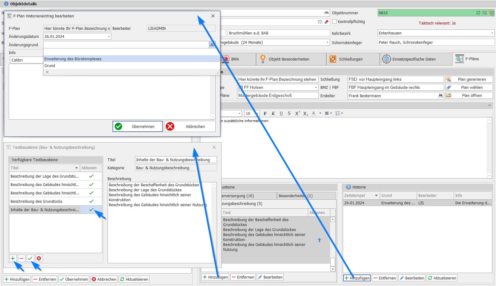 Diese Funktionalität stellt sicher, dass alle relevanten Veränderungen am Objekt und die daraus resultierenden Anpassungen im Feuerwehrplan transparent und nachvollziehbar dokumentiert sind.