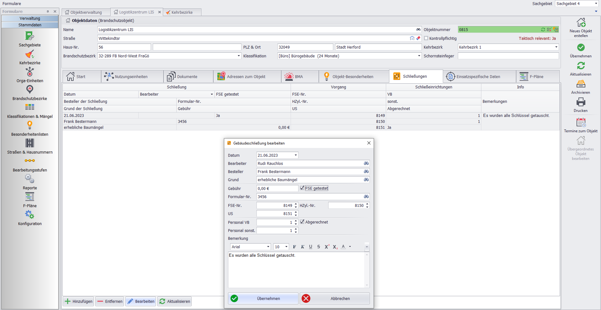 In diesem Formular können Informationen zu einer Schließanlage für das Hauptobjekt oder die Nutzungseinheit hinterlegt und dokumentiert werden. Es kann vorkommen, dass Objekte aufgrund von Baumängeln oder mangelhaftem Brand-/Gefahrenschutz geschlossen werden müssen. Dies hat zur Folge, dass Feuer- und Hilfeschutzeinrichtungen wie die Feuerwehrschlüsseldepots nicht mehr betreut werden können.