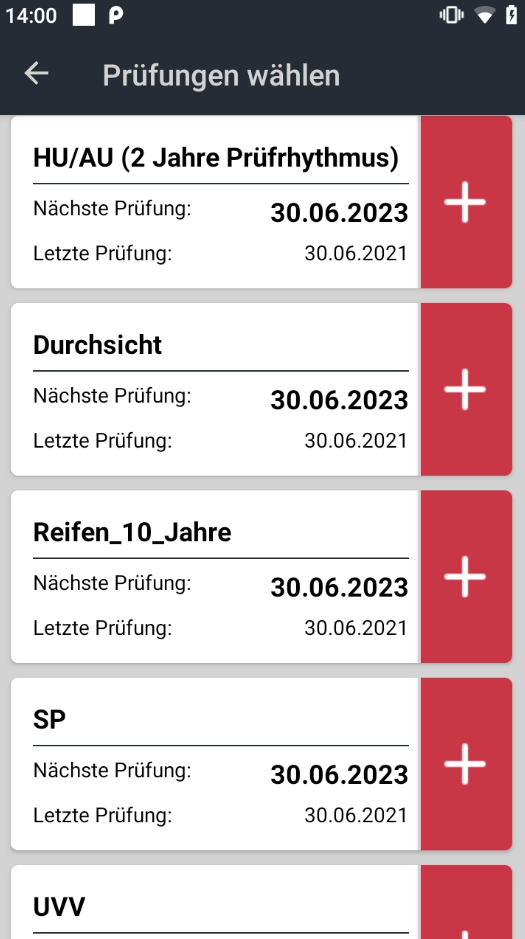 Sind alle Sollwerte gesetzt, erscheint links ein grüner Balken. Berührt man mittig das Feld Prüfung (z. B. HU/AU) erscheint das Formular Prüfpunkte.