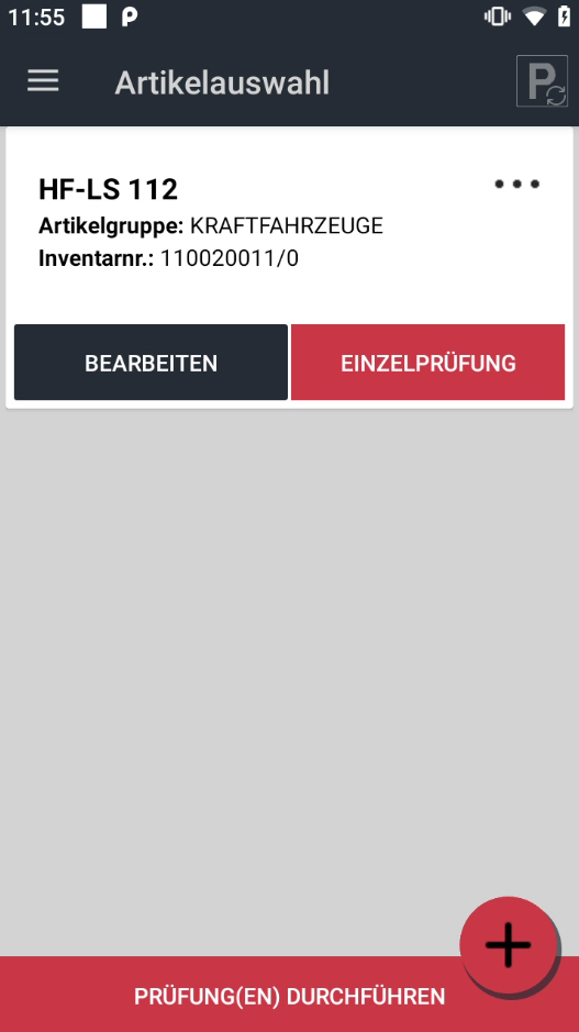 Scannt man direkt den ID-Code des Artikels, öffnet sich das Formular Artikelauswahl, indem man die Wahl hat, den Artikel zu BEARBEITEN oder eine EINZELPRÜFUNG durchzuführen.