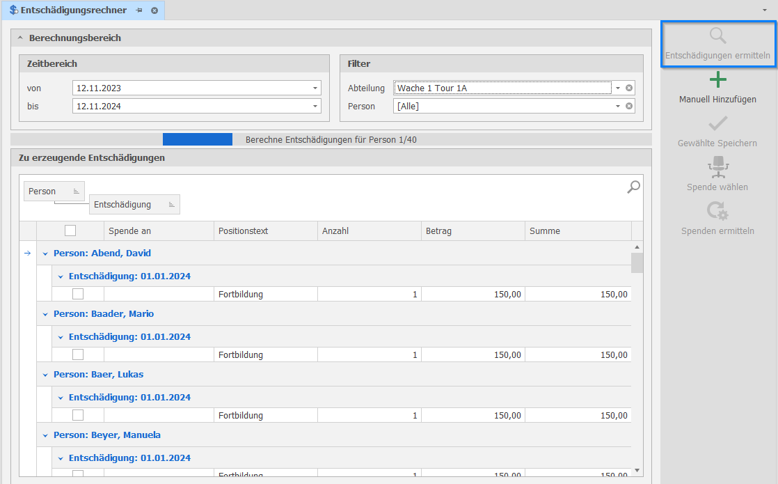 Der Entschädigungsrechner ist ein wichtiges Werkzeug zur Verwaltung und Berechnung der Aufwandsentschädigungen für Feuerwehrmitarbeiter. Er bietet verschiedene Funktionen zur effizienten Bearbeitung von Entschädigungen und Spenden.