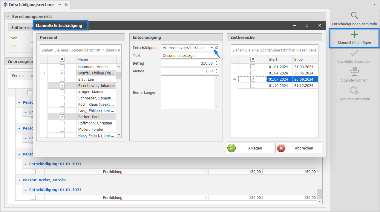 Ermöglicht das manuelle Erfassen von zusätzlichen Entschädigungen.