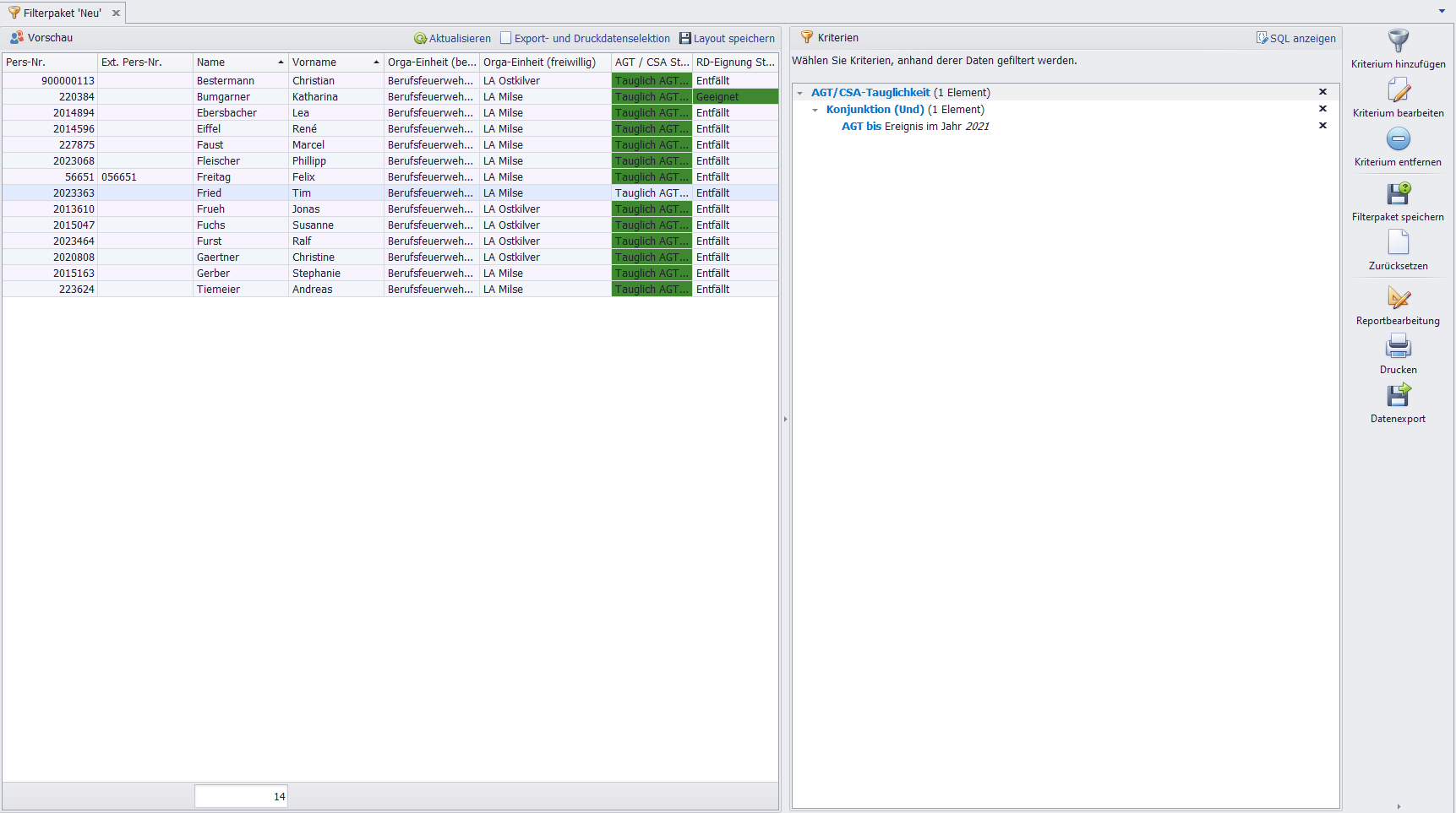 gewählten Kriterienund Parameter (z. B. AGT bis ist kleiner als Datum X UND Ereignis im Jahr ist gleich 2025).- Dient der