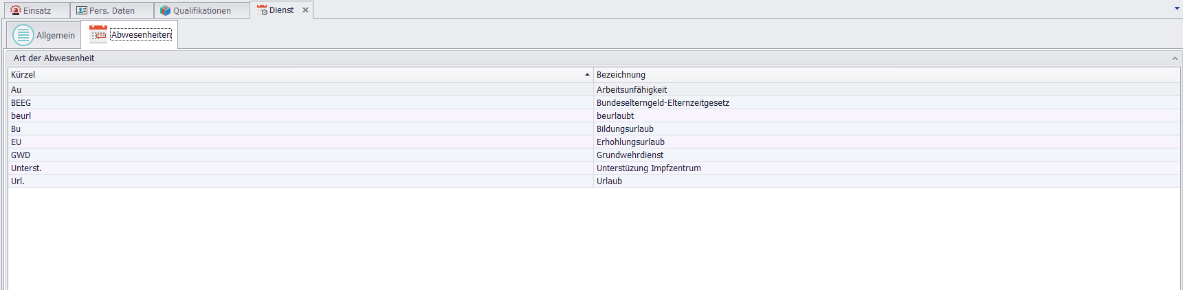 Erfassung: Im FormularAbwesenheitenkönnen Sie verschiedeneArten von Abwesenheitenhinzufügen, zusammen mit ihrenKürzelnundBezeichnungen.