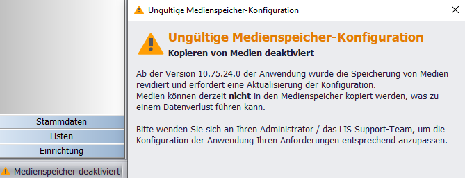 1.Dialog aufrufen : Sie können durch Anklicken des gelb hinterlegten Ausrufezeichens den Dialog "Ungültige Medienspeicher-Konfiguration" aufrufen, um Details zu sehen.