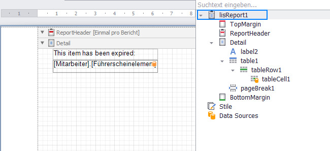 Statische Daten: → Zusätzlich zu den dynamischen, datengebundenen Inhalten kann das Detailband auch statische Daten enthalten. Diese werden für jeden Dateneintrag im resultierenden Bericht ebenfalls wiederholt.