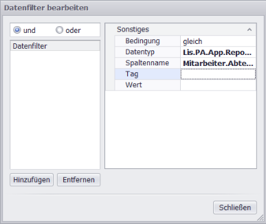 die Eigenschaften Datenfilter und erstellen im aufgerufenen Dialog, Filterkriterien