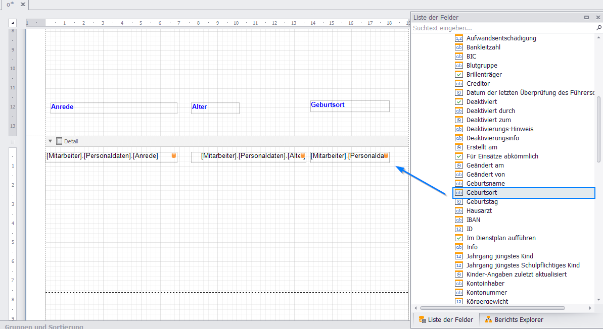 5. Kopfzeile und Detailbereich gestalten: → Geben Sie die Überschriften in die Zellen der Kopfzeile ein und verknüpfen Sie die entsprechenden Zellen im Detailbereich mit den Datenfeldern aus Ihrer Datenquelle. Ziehen Sie dazu die Felder aus der Feldliste auf die entsprechenden Zellen der Detailtabelle.