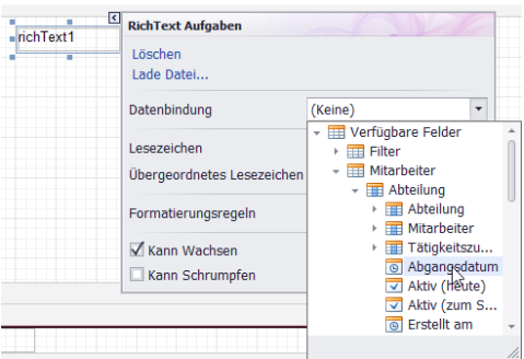 - Um ein existierendes Berichtselement an ein Datenfeld zu binden, klicken Sie die benötigten Feld-Items in der