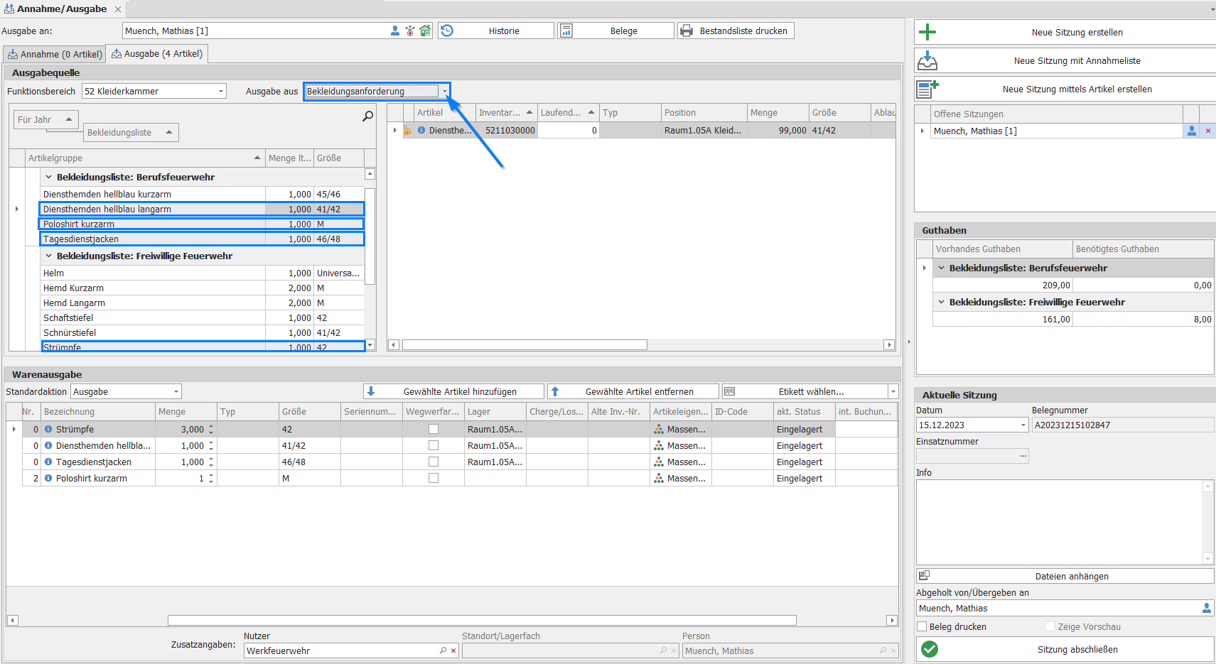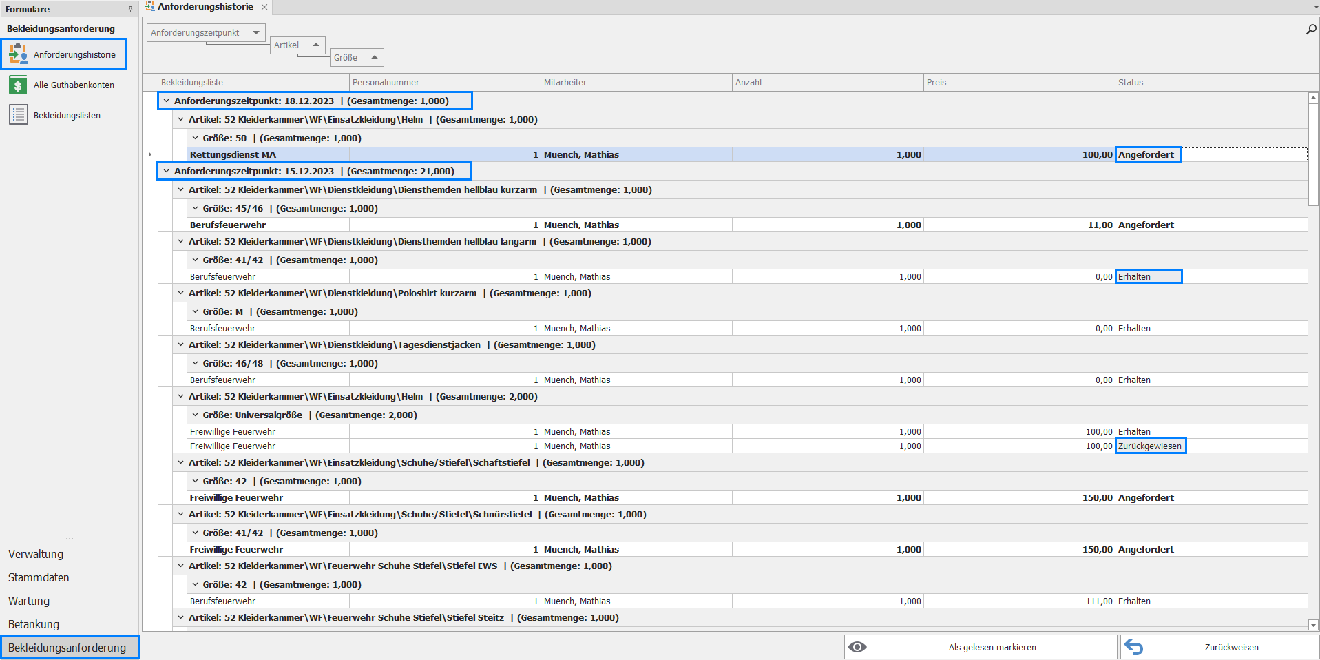 Bekleidungslistenangezeigt (z.B. "FF" für Freiwillige Feuerwehr, "BF" für Berufsfeuerwehr), aus denen der Mitarbeiter seine Artikel angefordert hat.Dies dient der finalen Überprüfung der korrekten Artikelliste.