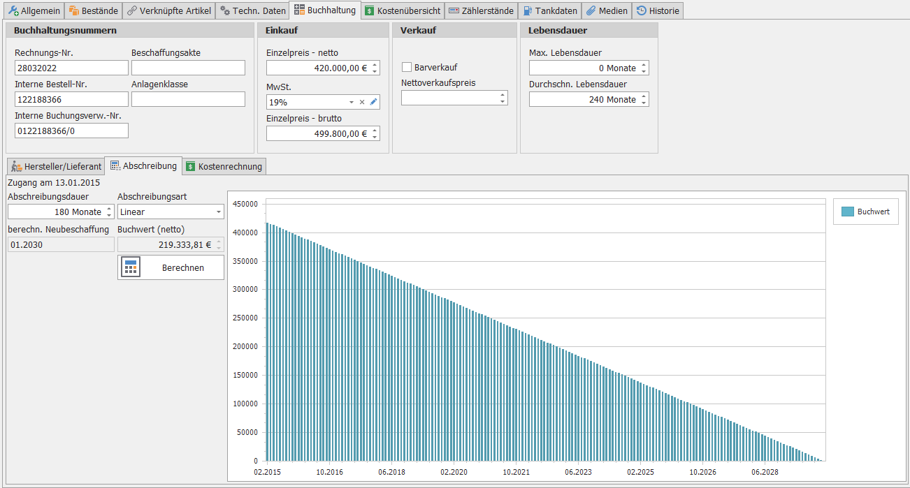 Zugang: Der Zeitpunkt, ab dem der/das Artikel/Gerät/Fahrzeug in Ihren Bestand aufgenommen wurde.Abschreibungsdauer: Der Zeitraum (gerechnet in Monaten), über den der Vermögensgegenstand abgeschrieben werden soll.Abschreibungsart: Das Prinzip der Abschreibung legt fest, wie ein Teil der Anschaffungskosten pro Jahr steuerlich geltend gemacht werden darf. Die Abschreibung erfolgt über die Jahre der Nutzung. Hierbei wird zwischen den einzelnen Abschreibungsarten Unterschieden.- Weiterführende Details zu den Abschreibungsarten finden Sie in den Stammdaten unter: Stammdaten Artikelgruppen Buchhaltung.