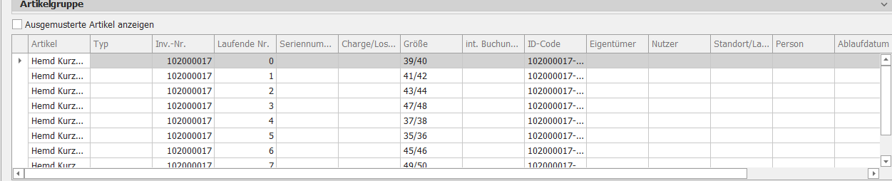 gemeinsame Inventarnummerinnerhalb einer Artikelgruppe. Die Unterscheidung der einzelnen Stücke erfolgt überindividuelle Laufende Nummern.Optionale Unterscheidung: Falls gewünscht, kann zur Unterscheidung bei Massenartikeln stattdessen auch die