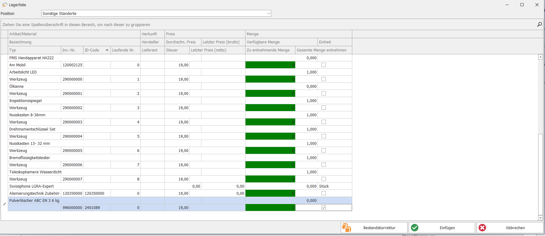 Wenn Material für einen Auftrag benötigt wird – zum Beispiel der Einbau eines Feuerlöschers wie im Beispiel – wählen Sie dieses über die Lagerliste aus.
