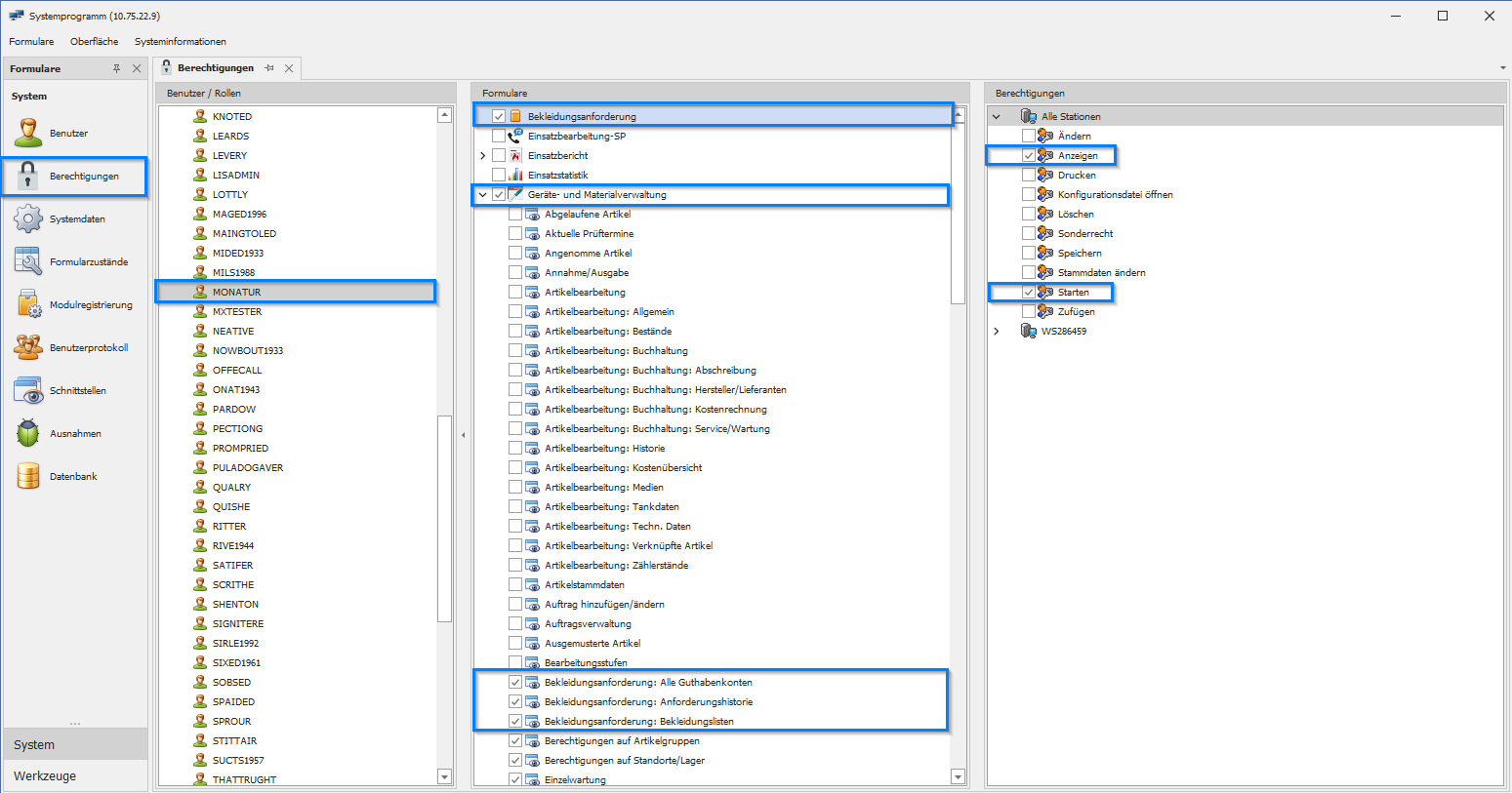 Die Konfiguration der Berechtigungen für das Mitarbeiterkonto im Modul Bekleidungsanforderung erfolgt über das Systemprogramm. Anhand des bereitgestellten Screenshots sind die relevanten Schritte und Bereiche erkennbar: