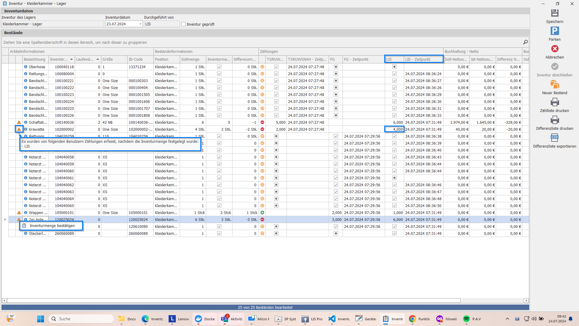 Diese visuelle Kennzeichnung und der Bestätigungsdialog stellen sicher, dass Inventurkorrekturen bewusst und nachvollziehbar vorgenommen werden.