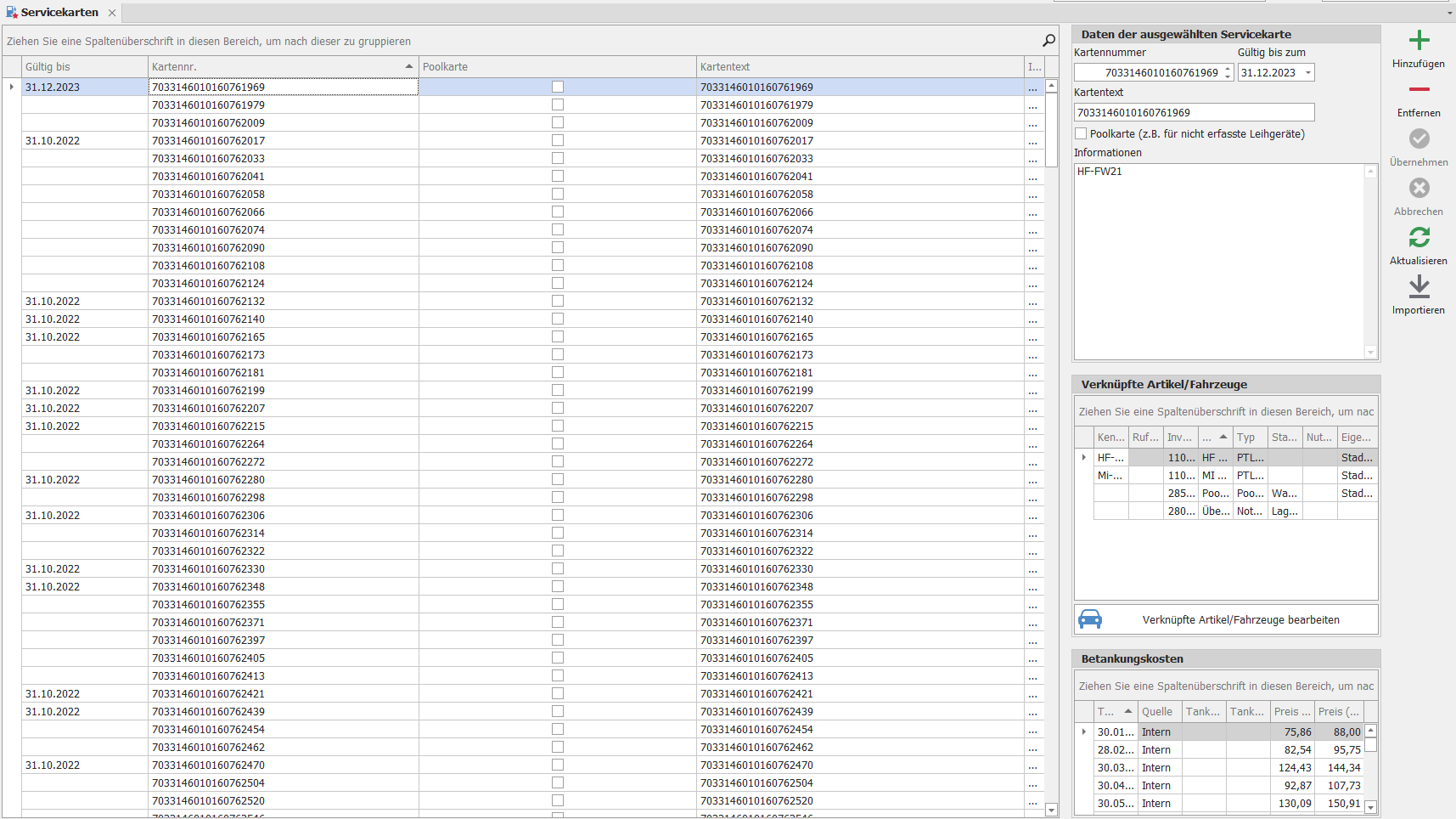 Nutzen: Diese umfassende Funktion hilft Ihnen, alle relevanten Informationen zu den mit einer Servicekarte verbundenen Fahrzeugen oder Artikeln sowie den zugehörigen Betankungskosten effizient zu verwalten und stets im Blick zu behalten.