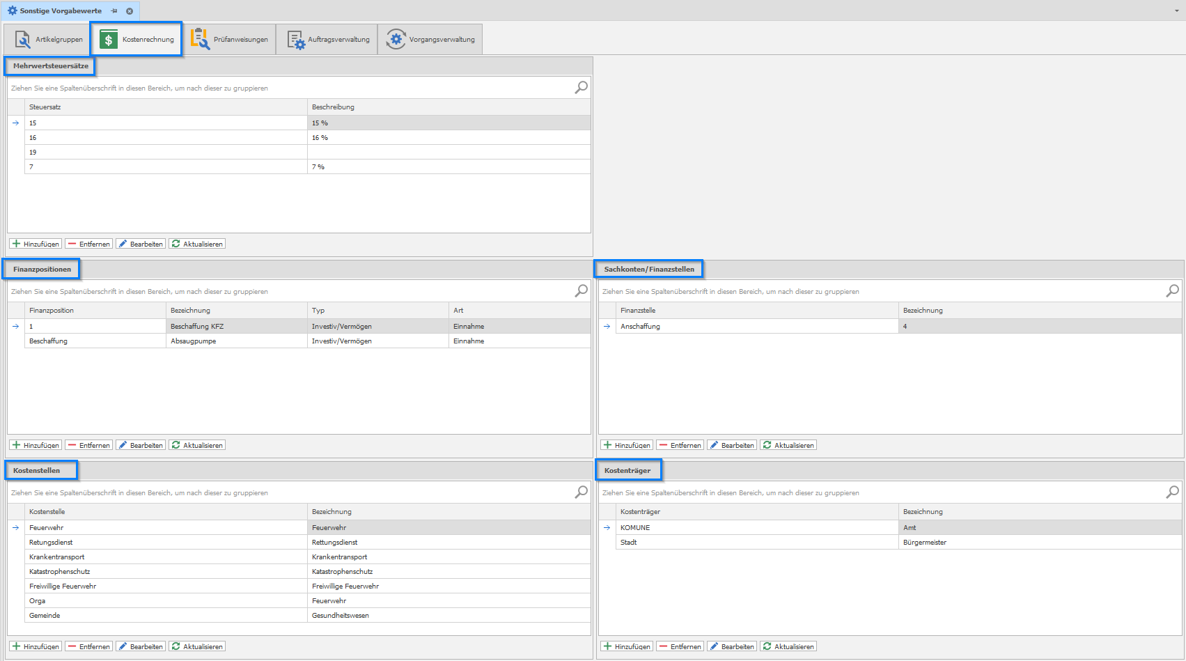 Mehrwertsteuersätze: Die vom Endverbraucher gezahlte Umsatzsteuer, die sich auf den von Unternehmen geschaffenen Mehrwert eines Produkts/einer Dienstleistung berechnet.Finanzpositionen: Dienen im Haushaltsmanagement der inhaltlichenGliederung der Budgetsund liquiditätswirksamen Geschäftsvorfälle in Einnahmen-, Ausgaben- und Bestandspositionen (Beschaffung).Sachkonten: Ein Konto der Finanzbuchhaltung, das für die Buchung laufenderGeschäftsvorfälleund des Jahresabschlusses verwendet wird.Finanzstellen: Eine organisatorische Einheit innerhalb eines Finanzkreises, die die Struktur einer Organisationhierarchisch abbildet(Verantwortungsbereiche, Abteilungen, Projekte).Kostenstelle: Hat die Aufgabe,Kosten zu sammeln, die innerhalb eines Unternehmensteils (zum Beispiel einer Abteilung) angefallen sind (z. B. Verwaltungskostenstellen, Materialkostenstellen).Kostenträger: Diejenigen Objekte (z. B. Kommune, Stadt, Land, Bund), denen Kosten zugerechnet werden können. In erster Linie handelt es sich dabei umDienstleistungen(z. B. ein Einsatz).