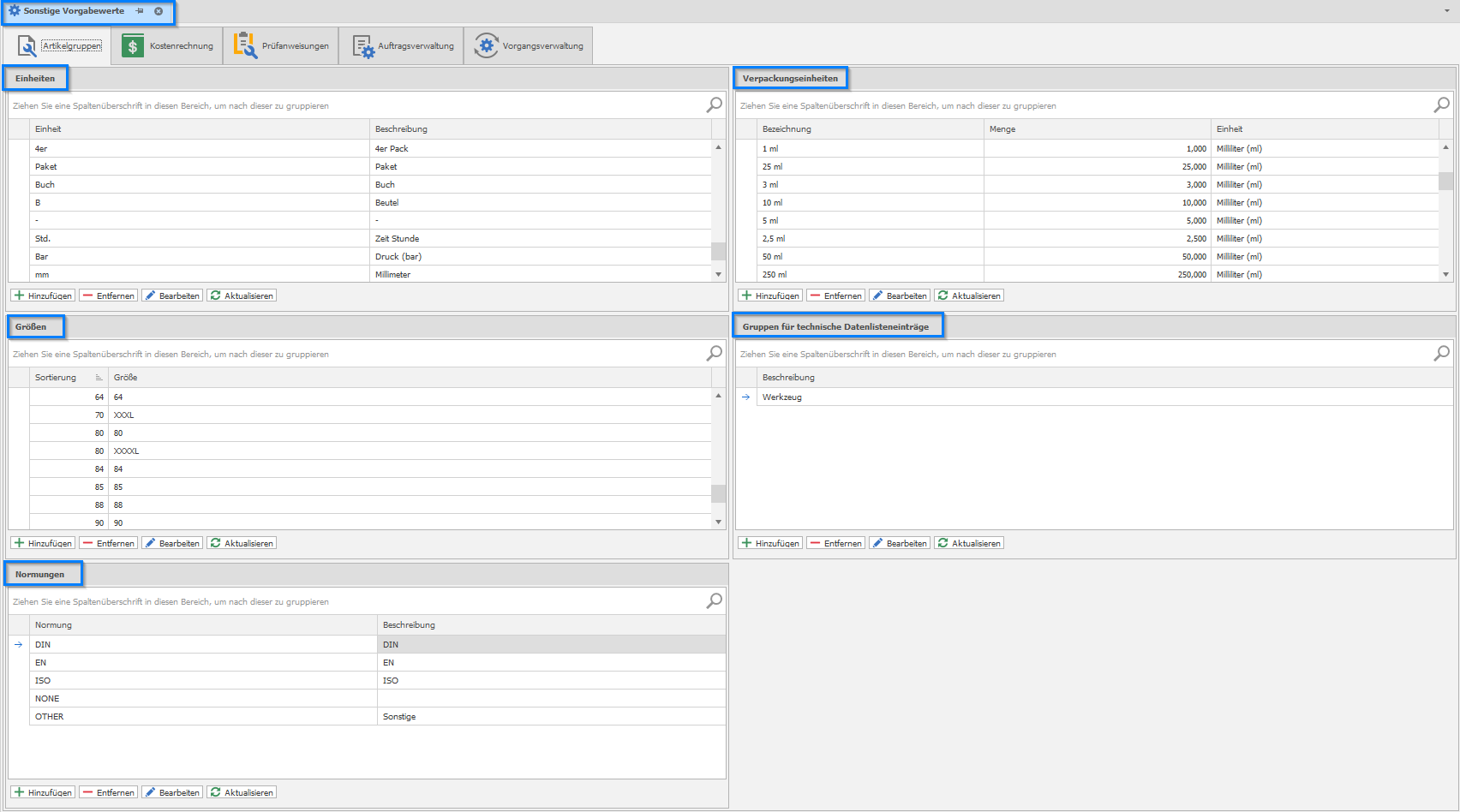 Das Formular Sonstige Vorgabewerte werden als Ergänzung zu den Artikelgruppen, die Kostenrechnung, Prüfanweisungen sowie für die Auftrags-/Vorgangsverwaltung verwendet. Die hier angegebenen Werte werden später in den Stammdaten zur weiteren Verarbeitung genutzt.