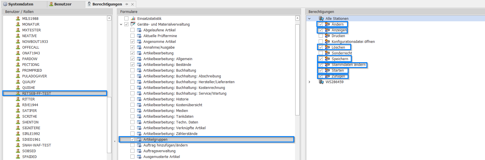 - Basiszuweisung: Wie im nebenstehenden Beispiel gezeigt, wurden dem Benutzer "Retseb-FF-Test" per
