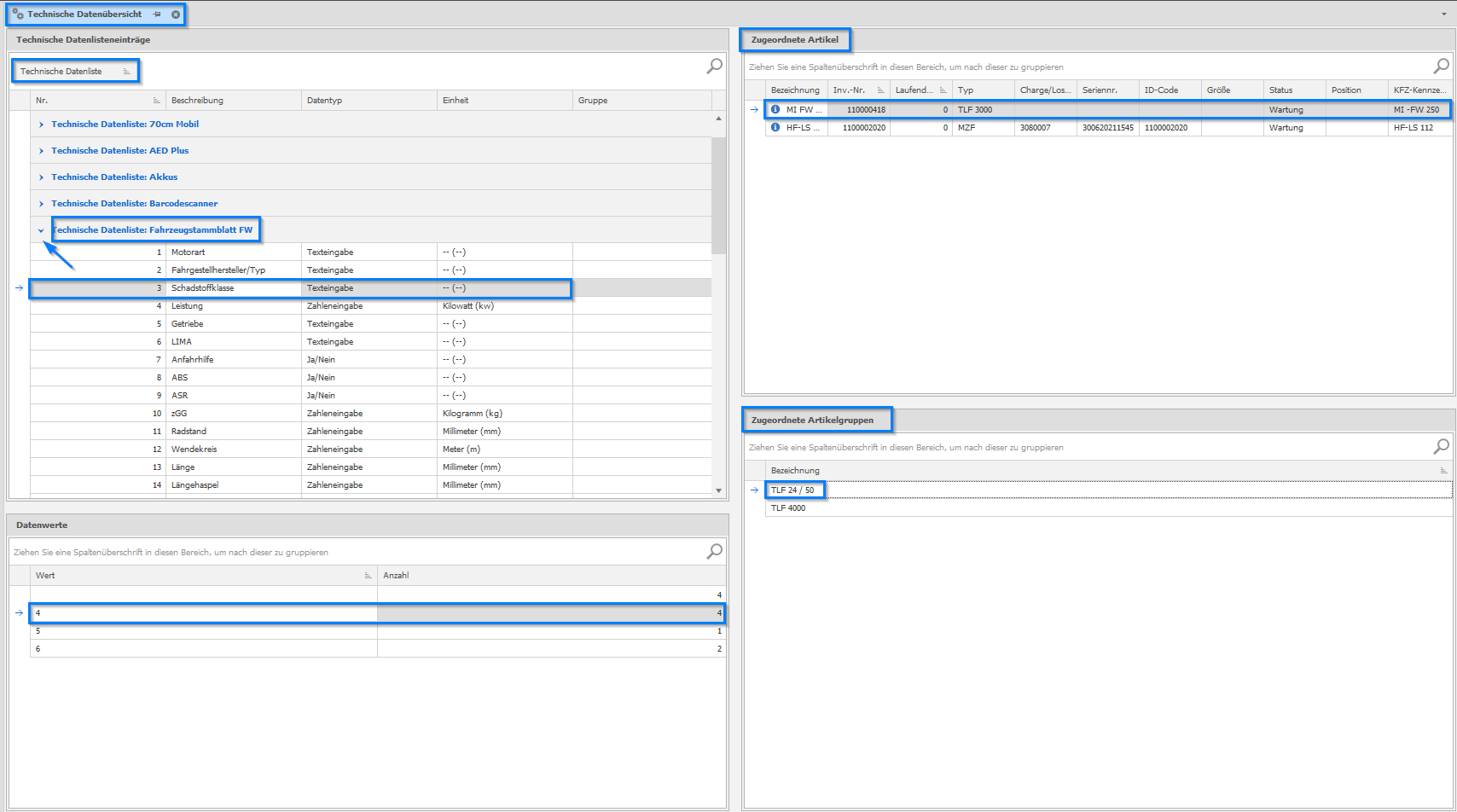 Beispiel: In diesem Beispiel sind die Zugeordneten Artikel sowie die Artikelgruppen TLF 24/50 und TLF 4000 aufgeführt.